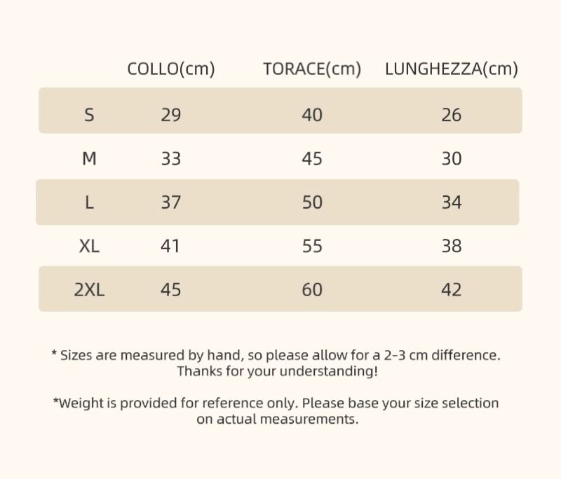 📏 Le taglie possono variare in base alla corporatura del cane. Si consiglia di misurare il pet prima dell’acquisto.